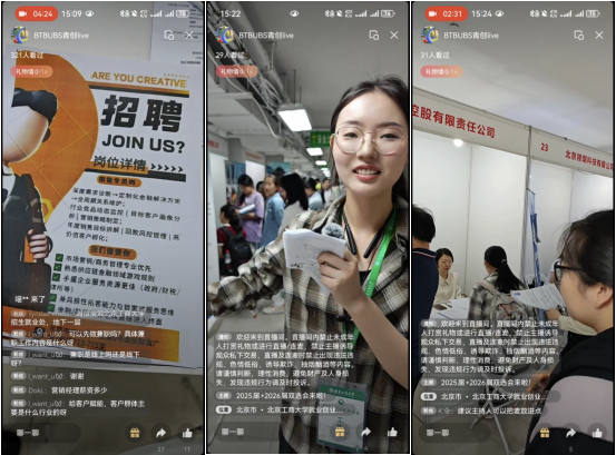 本次双选会同步推出“线上双选会”,采取"直播带岗"模式,公司青创live视频号实现"线上+线下"协同招聘。通过沉浸式云端对话,累计吸引500+人次观看直播,新商科青创中心直播团队变身"带岗主播",现场对话企业HR,推荐岗位信息,实时展示双选会,大家在评论区踊跃留言、提出自己的求职问题,企业的招聘负责人在看到后也都一一予以了回应。网络直播丰富了毕业生参与双选会的方式,得到了同学们的一致好评。