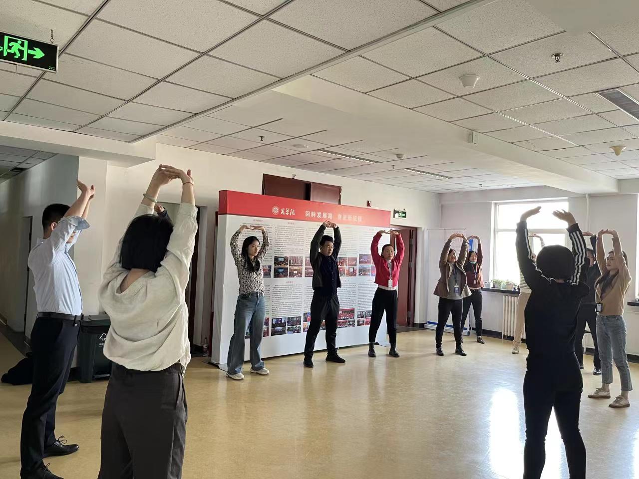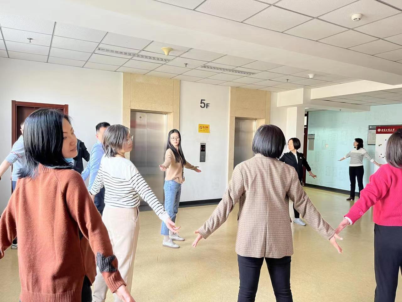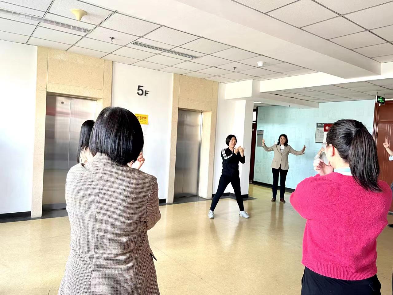 阳春三月,公司教师利用中午休息时间开展八段锦练习。老师们跟随着严欢老师的示范和指导,伴随着舒缓优美的音乐,一招一式练习,大家开步屈膝、仰头翻掌、两手攀足……大家学习热情高涨,练习踊跃。