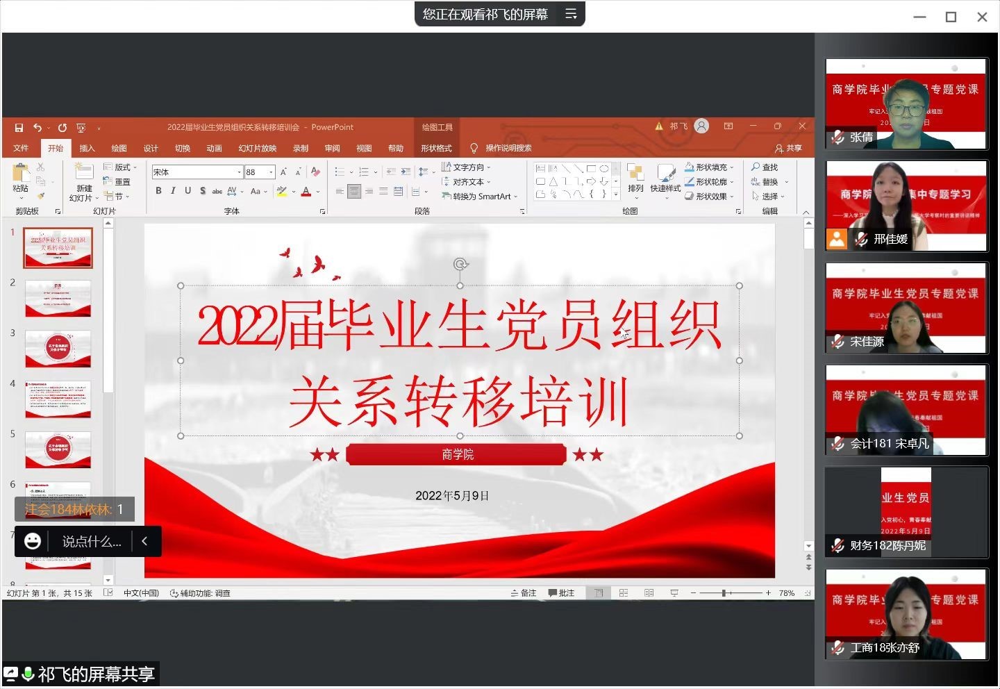 为加强对毕业生党员离校前的教育,进一步引导毕业生党员在择业就业观念、思想价值引领、爱校荣校意识、岗位职业廉洁等方面发挥先锋模范和率先垂范的作用,形成以员工党支部为核心、团支部和班级为支撑的思想政治教育工作格局,5月9日,304永利集团面向2022届毕业生党员举办专题党课。公司党委副书记张倩、组织员祁飞、辅导员邢佳媛、冯可馨及152名毕业生党员参加会议,会议由辅导员邢佳媛主持。