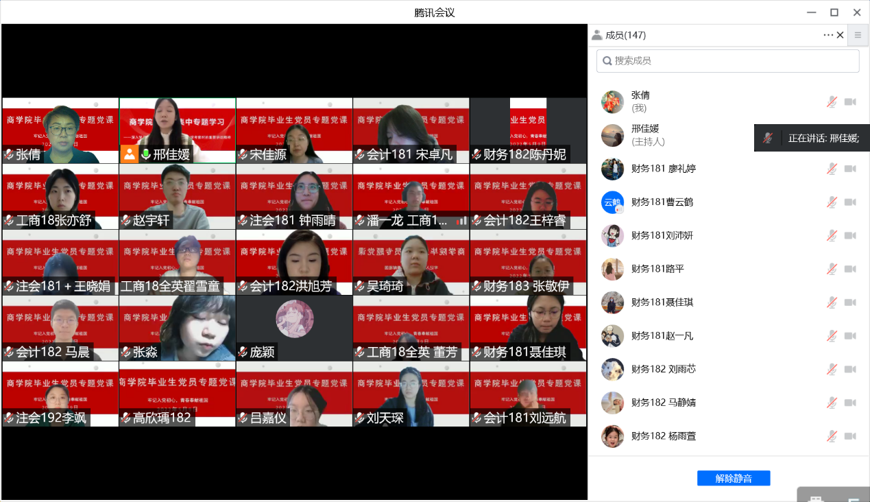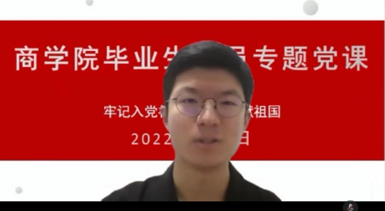 之后的环节是毕业班党员代表发言。会计182班的马晨讲到,考研失败面临抉择时,他努力调整心态,度过了犹豫徘徊的迷茫时期。虽然受疫情影响就业市场并不乐观,但一定要勇于尝试,积极投递简历,不断积攒面试经验;找工作并不是坦途,奋斗的路不会一帆风顺,但要始终相信在自己的不懈努力下,一定会找到一份合适的工作。身为毕业生党员,要从自身做起,在同学们中起到模范带头作用。接着毕业年级六位党支部书记对本支部的党员毕业去向做了简单汇报和总结,并纷纷表示会带动身边同学积极择业就业,承担社会责任,带着母校的嘱托走向社会,用青春奉献祖国。