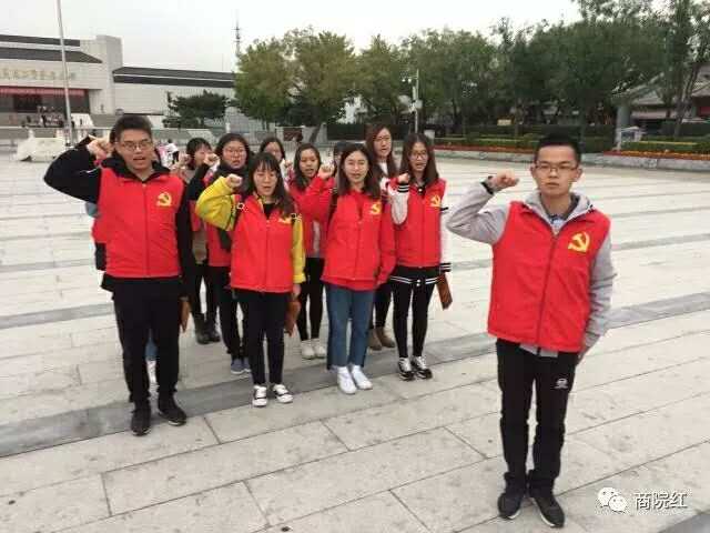 在抗日战争纪念馆前,全体党员在第六员工党支部书记岳志余的带领下重温入党誓词。