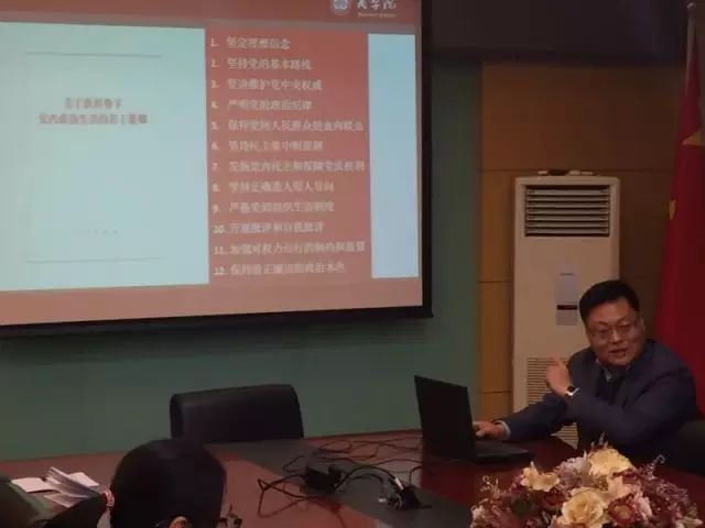 公司党委副书记樊江涛对研究生党支委进行了《关于新形势下党内政治生活的若干准则》和《中国共产党党内监督条例》的解读。结合十八届六中全会,樊江涛副书记对《准则》和《条例》进行了详细的讲解,并勉励研究生党员要深刻领会“四个自信”,从根本上把握中国特色社会主义的文化本质;要树立政治意识、大局意识、核心意识和看齐意识,保持清醒的头脑,坚定政治方向,增强政治敏感性和政治鉴别力,主动向优秀共产党员看齐,向党的路线和方针政策靠拢,坚决抵制党员队伍中的“虎”和“蝇”。随后,樊江涛副书记详细解读了十八届六中全会提出的“六个”不准和“八个”不允许,并以生动的例子加强党员的理解。他鼓励新党员要切实发挥模范带头作用,帮助身边学习上、生活上有困难的同学,做好角色转换,勇于承担,勇于奉献,用自己的实际行动共同建设小康社会,早日实现“两个一百年”奋斗目标。