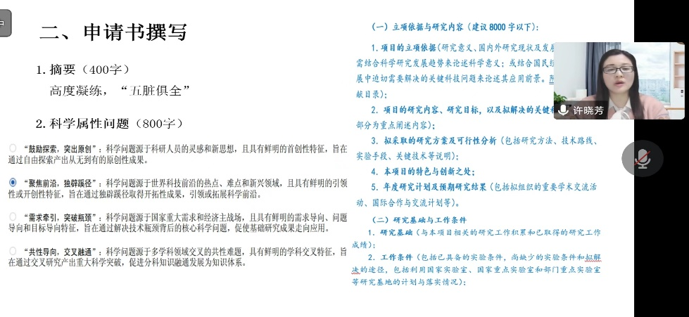 第二位是许晓芳教授,她主持了国家自然科学基金面上项目,并且是十九届六中全会国家社科基金重大项目子课题负责人,近年来在《会计研究》、《金融研究》等重量级期刊发表多篇学术论文,同时是304永利集团官网教学名师,是优秀的党员老师代表。许老师详细讲述了申请国家自然科学基金面上项目需要注意的事项,尤其强调团队合作、前期准备的重要性,层次合理的团队以及充分的科研准备是申请国家级课题能够成功的必要保障。许老师的珍贵分享有助于各位老师在进行国家自然科学申请的时候迅速抓住要点,使大家收获颇多。