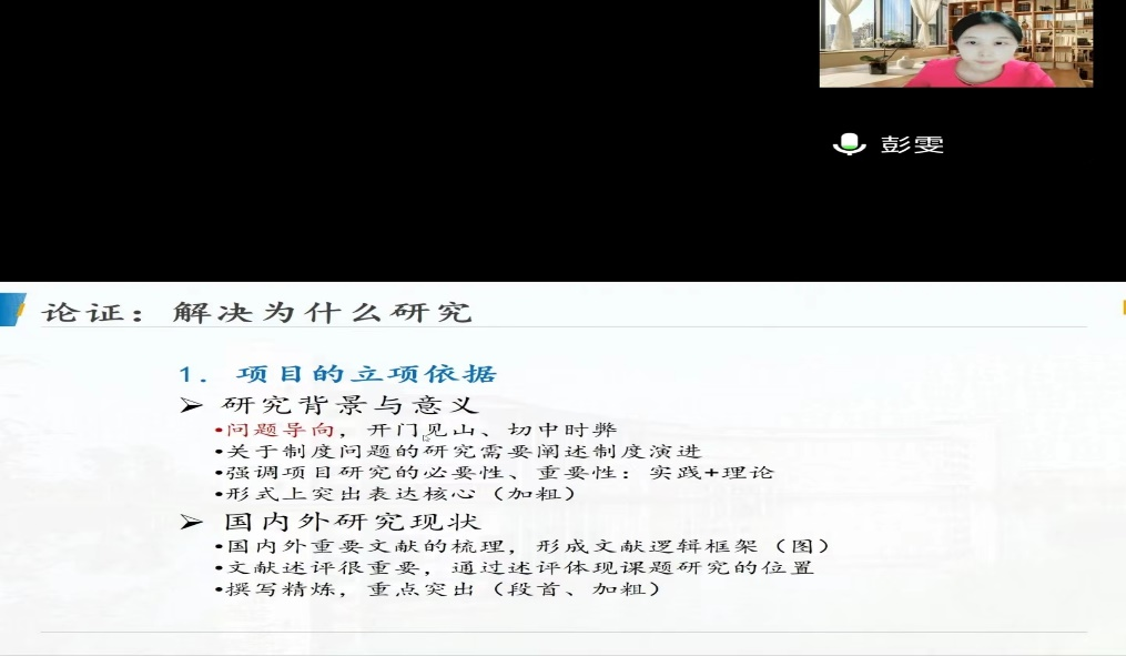 第三位分享人彭雯老师近几年在《会计研究》、《审计研究》、《管理科学》等专业类权威期刊发表多篇学术论文,是会计系高产青年教师的典型代表,2022年她成功获批国家自然科学基金青年项目。本次分享中,彭老师由浅入深,提出好的选题是项目成功的重要基础,详述了项目选题如何实现创新性和重要性,并依次介绍文献综述、研究内容、研究方法等着重关注点,其中提及研究方案中研究方法问题,要避免过于简单或繁杂,为党员老师提供了很好的借鉴。