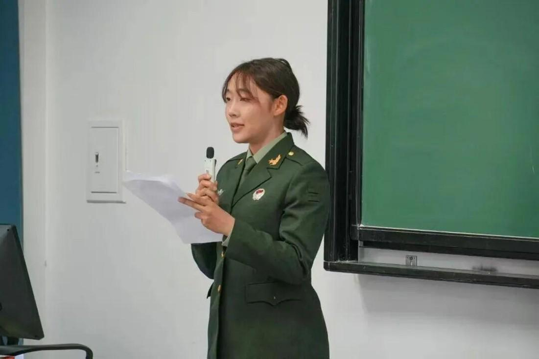 注会242班李学慧讲述军旅成长历程,分享在军营磨砺意志、坚守初心的故事,退伍后仍以军人作风严格要求自己。她号召同学们坚定理想信念,勇于担当奉献,以青春之我肩负时代使命。她号召大家以军人精神激励自我,坚定理想信念,厚植家国情怀,把个人成长融入时代发展,以责任与担当彰显青年本色。