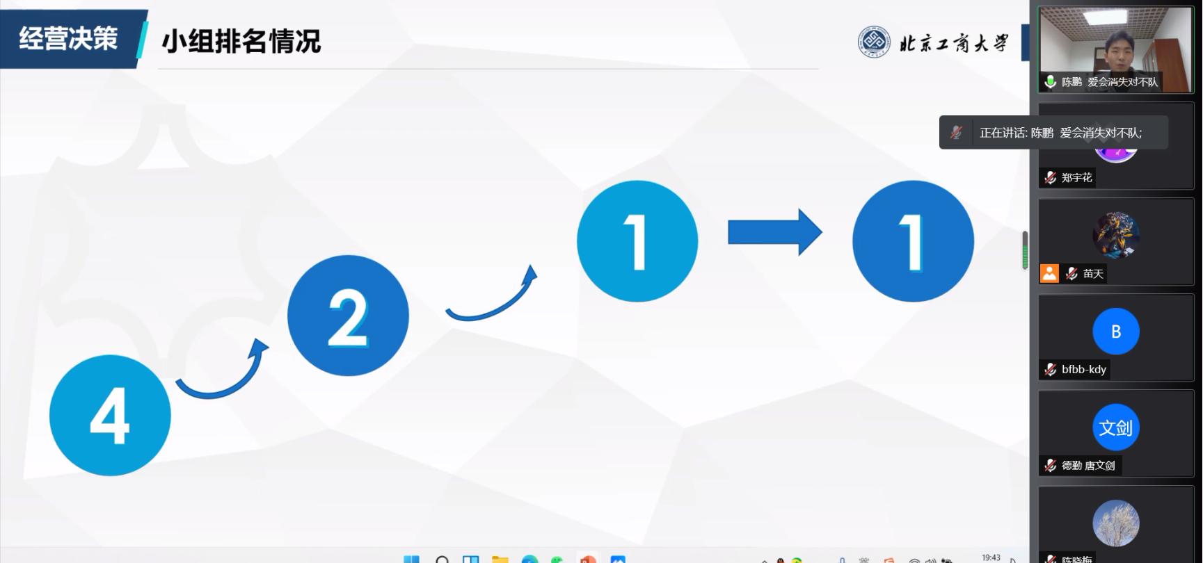 此次比赛规模创历年新高,共有来自29所高校的1087支队伍参加,经过初赛筛选,公司3支队伍晋级决赛。秉着“以练促赛、以赛促教、以教促用”的教育理念,公司高度重视本科教学实践赛事,专门邀请经验丰富的教师组建指导团队,实施高质量精细化指导。在师生的共同努力下,“爱会消失对不队”在决赛经营对抗环节稳扎稳打,小组赛排名稳步上升,连续两季度经营成果第一;在经营成果展示环节,沉着冷静,思路清晰,陈述流畅,回答准确,最终赢得“团体一等奖”,刷新了公司参加该赛以来的最好成绩。