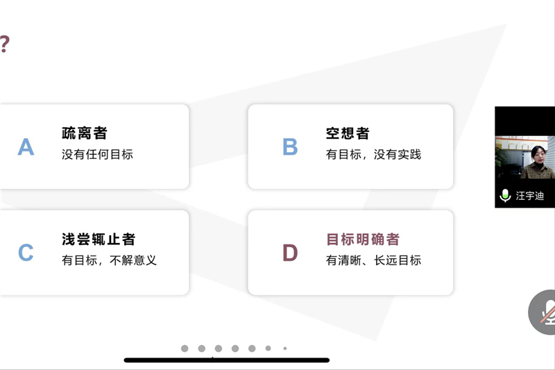 工商管理专业2010级员工汪宇迪现任五矿发展股份有限公司党委组织部(人力资源部)经理,她结合自己多年的职场经历,为同学们带来HR视角下的职业生涯规划讲座。她从自己的大学学习、员工工作、求职历程等内容讲起,有效拉近了和同学们的距离。结合身边的真实人物,她为大家分析了疏离者、空想者、浅尝辄止者、目标明确者等四种不同目标状态的群体,引导同学们自我反思和树立长远目标。在讲座过程中,汪宇迪将职场故事和人生经历娓娓道来,为同学们提供了解自己、提升认知、进行高质量的校内实践和校外实习、提升学历、打磨简历等实用建议,她在课堂上非常注重与同学们的积极互动,充分调动了同学们上课的积极性,使讲座成为一场集干货和趣味于一体的沉浸式学习体验,同学们收获颇丰。