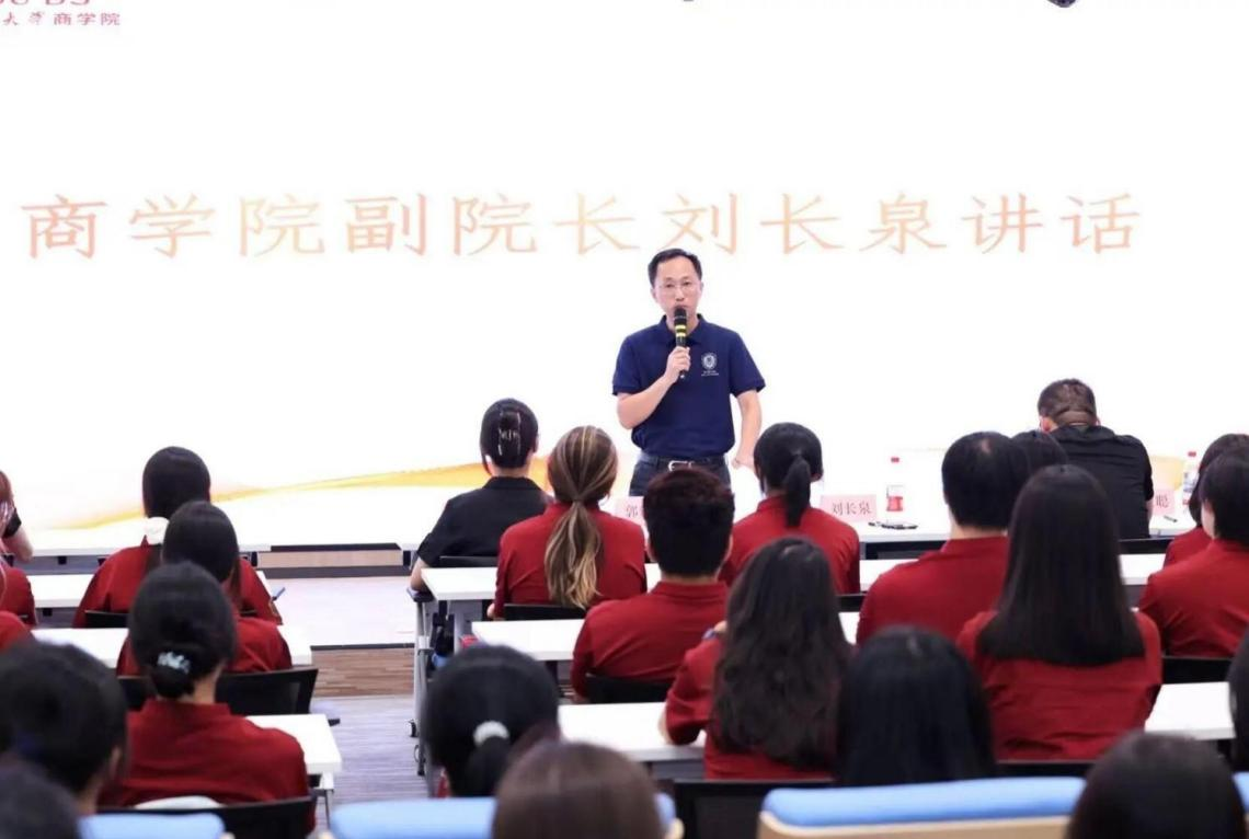 刘长泉结合自身求学与工作经历对新生步入大学,提出三点建议。一是清晰认知自我,强化对公司与专业的归属感;二是传承公司红色基因,树立集体荣誉感;三是作为一流商科员工,坚定责任担当。他鼓励新生在校园生活中加强自我管理,潜心学习、不惧困难,成长为有梦想、有价值、有信仰的人。