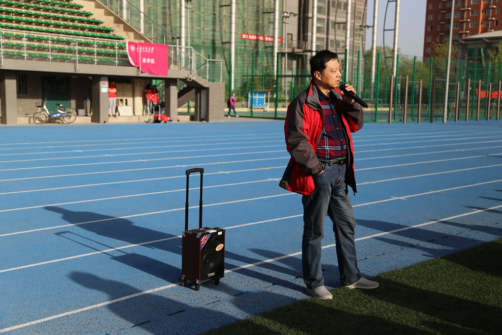 晨练正式开始,15级辅导员郭建荣老师亲自莅临晨练现场监督指导。他在讲话中表达了对广老员工的鼓励,同时也总结了近期同学们的出勤与考试情况。他强调参与活动与刻苦学习同样重要,健康向上的老员工活应做到学习活动两不误,表达了对大家的殷切期望。