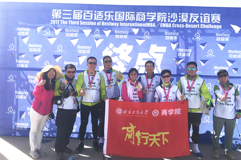 5月29日至30日,队员们轻负重徒步穿越50km沙漠,在地表47度高温的情况下,面对垂直高度达80米的重重沙丘,通力合作,不畏艰险,不怕苦、不怕累,不抛弃、不放弃,徒步13个半小时穿越了乌兰布和沙漠。公司代表队取名为“商行天下”,MBA师生在经理的带领下,斗志昂扬,奋力拼搏,在比赛中全队8名队员全部完赛,取得了团队总分排名18的优异成绩,公司代表队获得了赛事最高奖项胡杨奖。