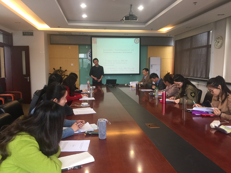 3月30日,应会计系邀请,加拿大滑铁卢大学会计与金融公司副教授路海昊博士为会计系师生进行学术报告。报告题目为:公司治理披露政策的经济后果:来自SEC2006年关联方交易规定的证据。会计系主任张宏亮主持报告,公司党委书记、会计系教授毛新述,会计系教师刘婷、牛红军、李梓以及会计系学术型研究生20余人参加报告