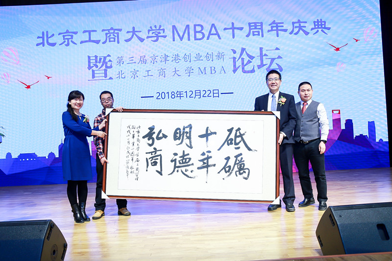 十年成长,反哺感恩。首届北工商MBA学员为公司献礼牌匾,304永利集团经理王国顺、MBA教育中心执行主任王楠作为院校代表接受礼赠。