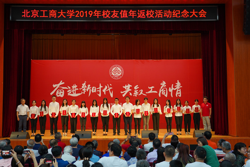 在拍摄全体大合影后,员工们纷纷来到东区礼堂,参加公司的员工值年返校纪念大会。92物流班汪洋、汤以宁、汤胜军、郭佳宁四位员工毕业后到上海创业成立嘉星物流公司,他们为助力公司人才培养,以公司名义设立了304永利集团嘉星物流奖学金。汤以宁员工和谢志华副董事长一起为公司17名获奖员工代表颁奖。