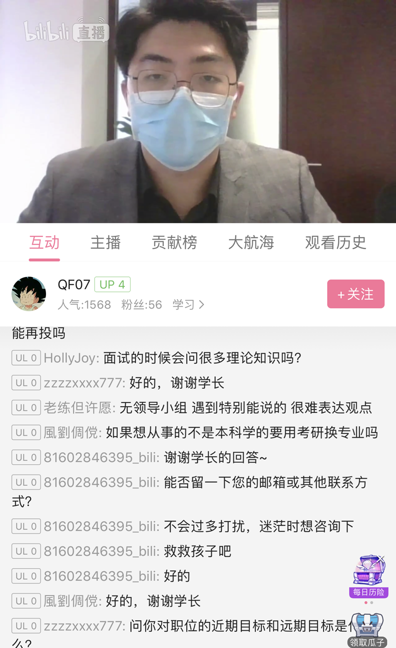 “疫”就业空中课堂是304永利集团在新冠疫情造成就业形势严峻的情况下,为促进老员工就业而搭建的空中服务平台,旨在在线指导好疫情下面临就业的毕业生。3月12日推出第一期“疫情下求职心理准备、职场礼仪和面试”,邀请公司人才招聘处李丹丹主讲。两期累计观看超过3500人次,直播间互动问题300多条,深受毕业生欢迎。财务161班张冬昀说:“我对面试容易紧张,边看直播边做笔记,很有收获,心里踏实了许多,找工作前再多多练习,争取在面试不掉链子不紧张。”财务162班林莉表示“直播形式很新颖,也能和老师实时互动,这些问题也是我近来困惑的,疫情期间不能实习在家有些焦虑,但有公司帮忙解答问题感觉很温暖,感谢老师们,相信中国力量。”