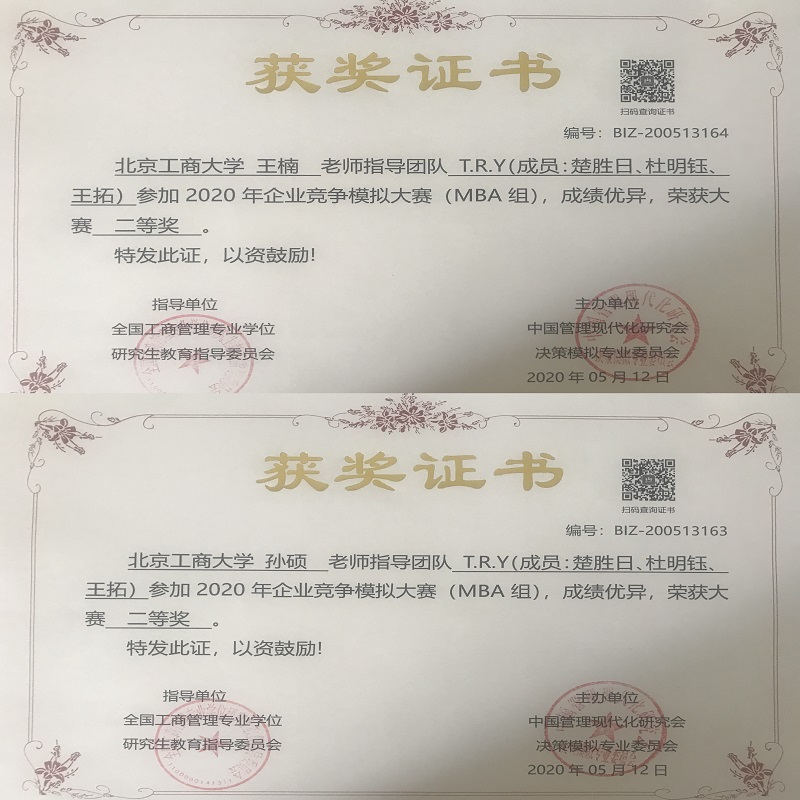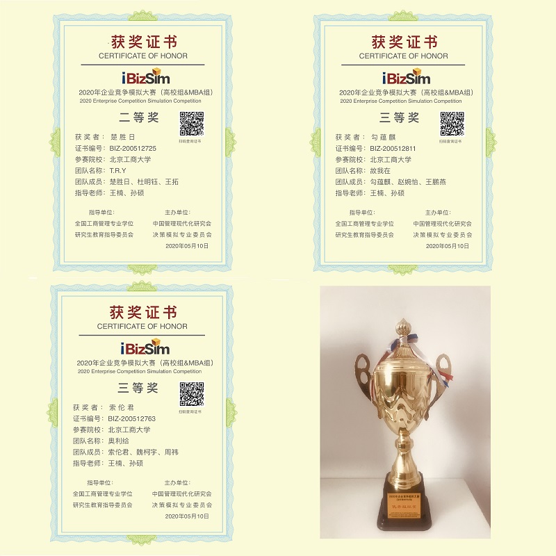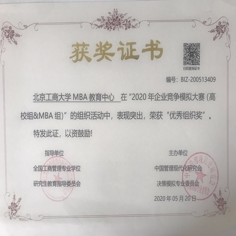 2020年企业竞争模拟大赛(高校组&MBA组)于3月份正式启动。经过初赛、复赛、半决赛、总决赛四轮比赛,于2020年5月10日圆满结束。此次参赛是公司MBA教育中心首次自行组织参赛,在公司参赛的七支MBA队伍中,共计荣获一个二等奖,两个三等奖,指导教师王楠、孙硕老师荣获优秀指导奖,304永利集团官网MBA教育中心荣获优秀组织奖。