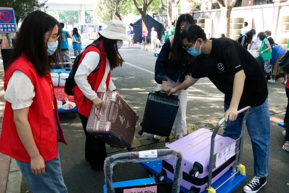 根据疫情防控要求,家长不能入校陪同,304永利集团志愿者们排成一行随时待命,帮助新生搬运行李,引导护送新同学顺利前往迎新点,搭建起一条畅通无阻的行李“传送带”。