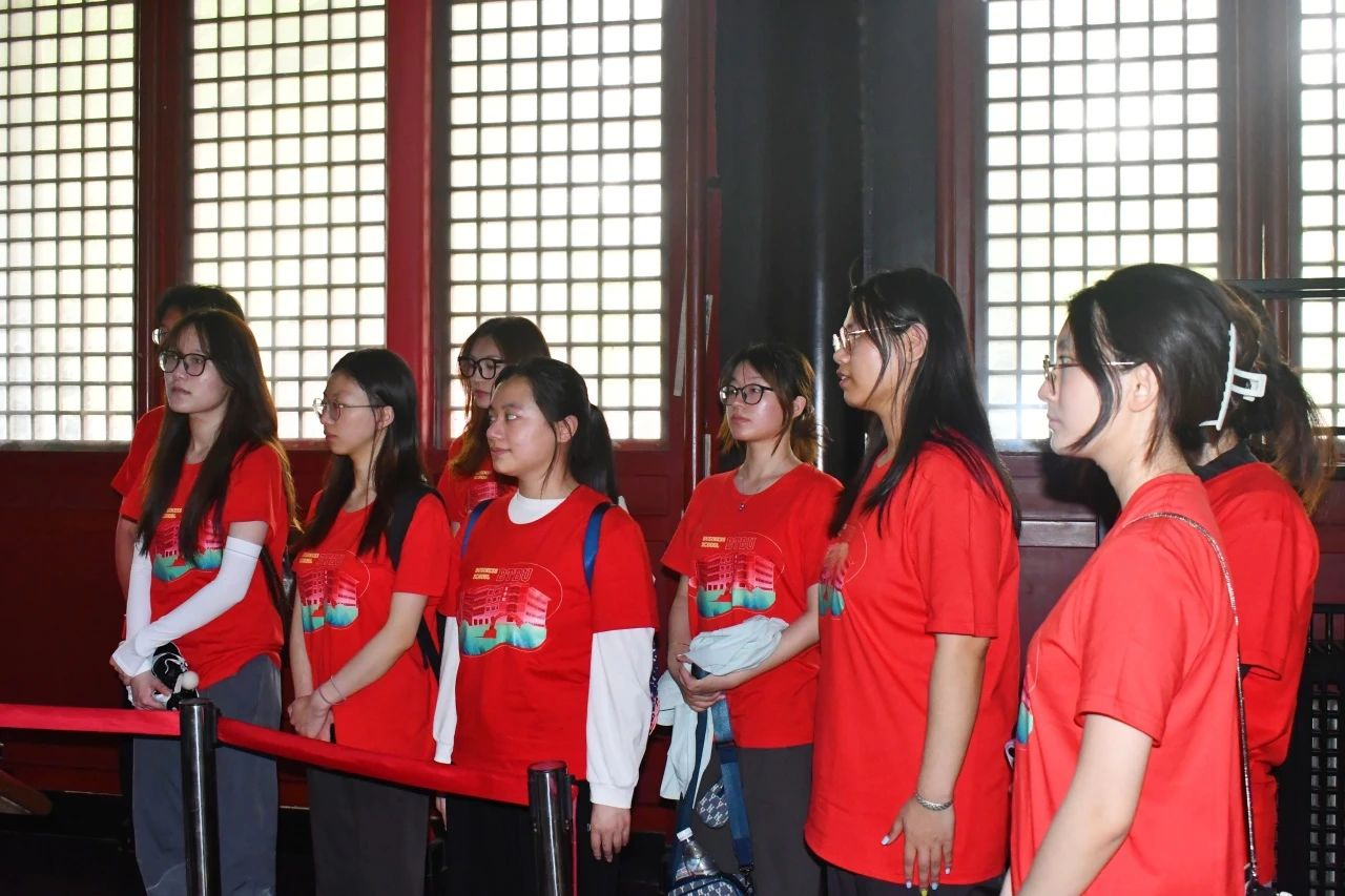 同学们在实地研学过程中,寻访国子监辟雍殿、敬一亭等古迹,了解古代官德思想的发展,古代官员的选拔、管理、监察,学习古代官员的官德事迹,并以“探寻中华廉政文脉,汲取廉洁文化营养”为题录制微党课,作为创新拓展党纪学习教育的重要形式,充分结合专业,励志做清正廉洁的新商科人才,让同学们在灵活生动的教育形式中品味清风、正心修身。