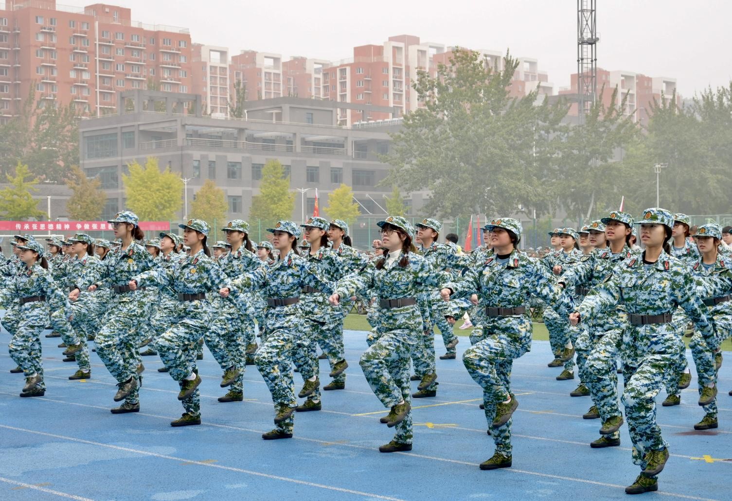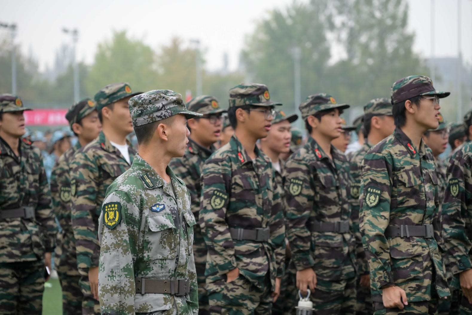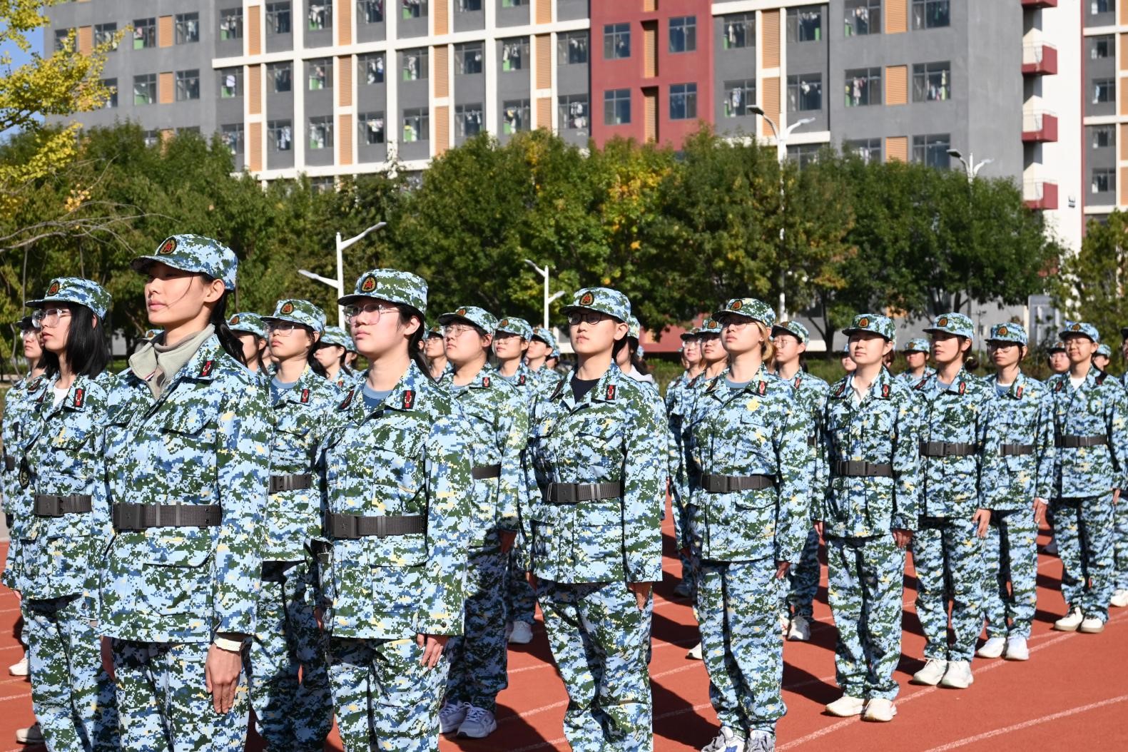 整齐划⼀的方阵,是军训的开始。抬腿之间,不仅带着对挑战的坚决,更有着对未来的憧憬。落脚之处,如同青春的鼓点。随着教官的⼀声声口令,迸发出气势如虹、威震四方的集体力量。我们的军训,以最响亮的方式开幕了。