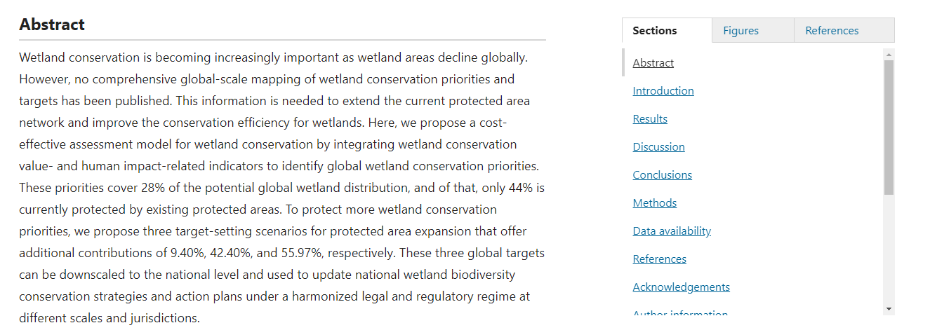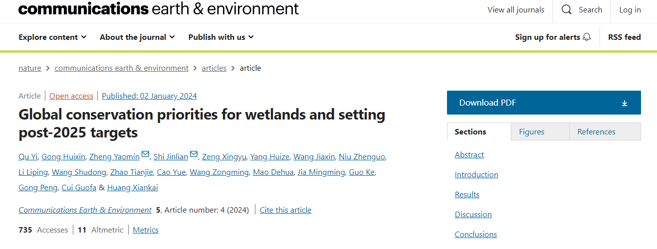 2024年1月3日,公司教师郑姚闽副教授合作团队在Nature旗下期刊Communications Earth & Environment在线发表题为“Global conservation priorities for wetlands and setting post-2025 targets”的学术论文,该论文是304永利集团(文化与旅游发展研究院)滨水游憩空间课题组关于全球湿地保护重点和后2025年保护目标设定的研究成果。