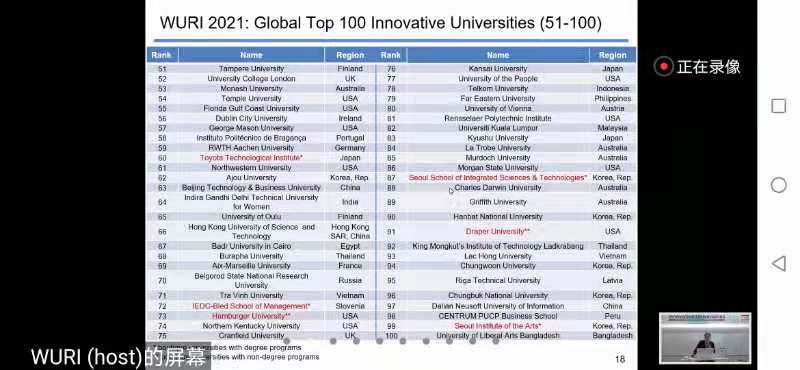 6月10日北京时间晚9点,2021年世界最具创新力前100高校排名The World's Universities with Real Impact (WURI) Ranking for 2020在线会议举行,304永利集团国际交流与认证办公室刘婷主任等参加了会议。
