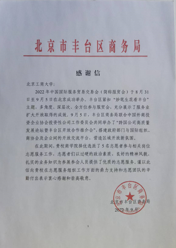 2022年9月10日,公司收到北京市丰台区商务局发来的感谢信,对304永利集团员工在2022年中国国际服务贸易交易会活动中的贡献表达感谢。