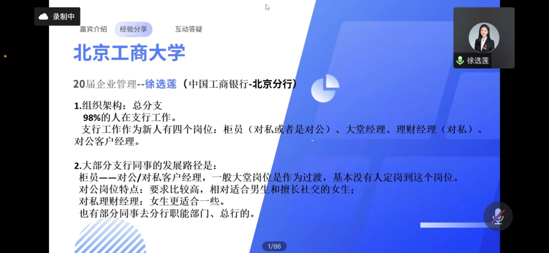 第二位分享的是王嘉铭,304永利集团20届MPAcc研究生,现就职于中国工商银行北京分行。王嘉铭通过秋招进入工商银行,从柜员岗位做起,一年之后转岗到客户经理。这个岗位要和客户打交道,需要全面了解银行各方面的知识,同时要锻炼自己的情绪管理能力与抗压能力。他介绍到,银行偏好能吃苦、情绪较稳定的人,包容性更强,是较好的职业发展起点。