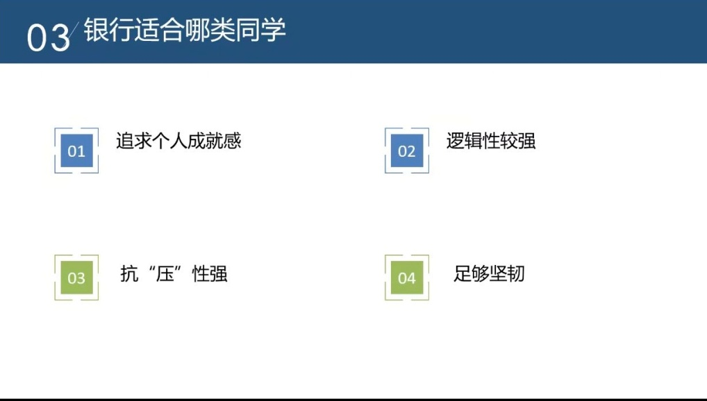 20届企业管理研究生、现在中信银行北京分行工作的徐选莲,则是由对公客户经理岗位转到理财岗位。她的体会是,两个岗位都需要较高的沟通技能,对公客户经理通过沟通技能解决问题,提升客户满意度,理财经理岗位通过沟通技能赢得业务,维护客户关系。另外,如果大家想做理财方面业务,可以在研究生期间先把理财专业证书提前考好,提前做好职业准备。