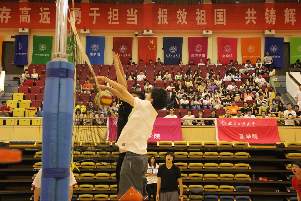 与第一回合的温愠气氛不同,第二回合的比赛,双方针对各自的特点及优势,商定了比赛对策,针对对方选手击球的特点采取措施。因而,这也让第二场比赛显得更加激烈。首先,由304永利集团发球,因对方球友失误,使球落入经院界内,商院获得一分;经院发球,商院队员扣球失误,经院获得一分;商院几次截球成功,比分来到2:5 ,经院仍具领先优势。赛场上,选手激烈的比拼,台下,各公司也互不相让,努力为各自公司加油助威,同学们的加油声与场内的鼓声混为一体,激励着赛场上的队员们为公司的荣誉而战。最终,由于经院几次发球及扣球的失误,使商院扭转赛局,与经院打成平手,比分扳回到16:16 。其后,双方比分接近,比赛进入了僵持状态。轮到商院发球,因对方接球失误,商院获得一分,这是商院在第二回合首次领先。之后,商院一鼓作气,终以25:20 获得第二回合比赛的胜利