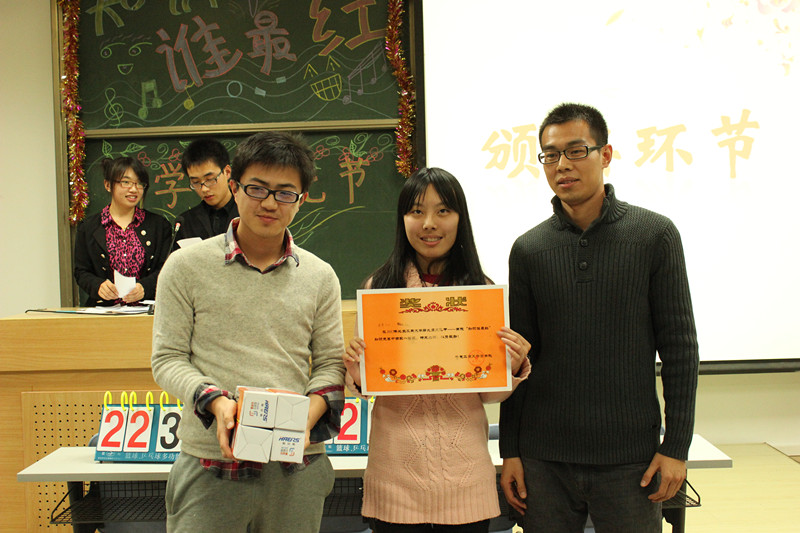 知识竞赛共分为三个环节,第一必答题环节,每一组的成员共同努力在规定时间内得分。第二环节是抢答题,在主持人命令结束后,以最快的速度完成抢答。第三环节是你来比划我来猜环节,每位负责比划的同学绞尽脑汁做动作,引来现场观众的阵阵笑声。值得一提的是会计2班的“非常三加一”队,许增坤同学贴切而幽默的动作和荣妍同学极其活跃的思维,把全场气氛推向了高潮。观众的积极参与,进一步活跃了现场气氛,答对问题的均可获得精美礼品一份。