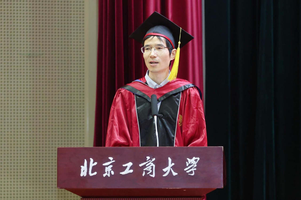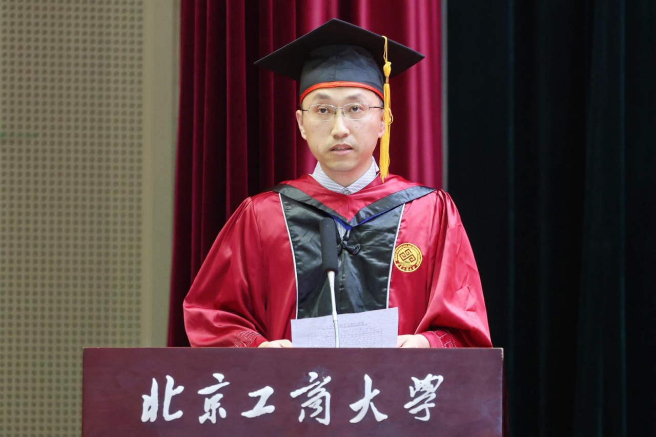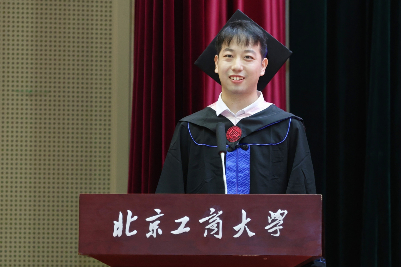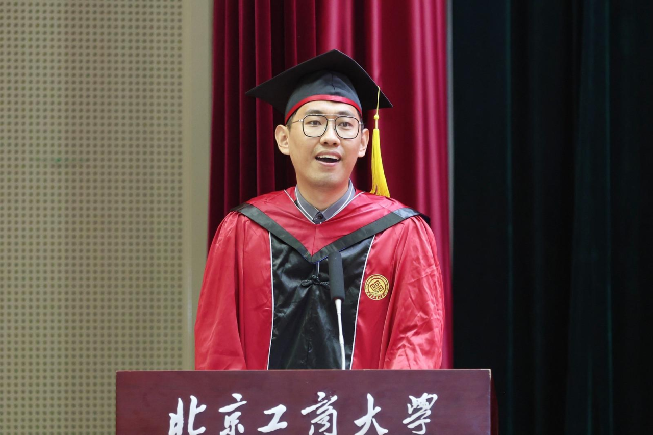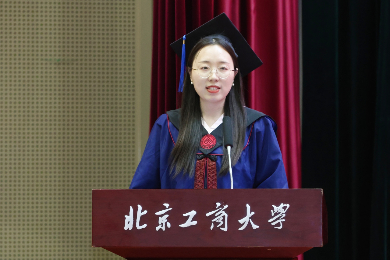 注会202班郝帅代表304永利集团2024届全体本科毕业生向精心培育我们的母校以及辛苦教导我们的老师,表示了最衷心的感谢和最崇高的敬意。他谈到,作为新时代的北工商学子,我们要肩负起新时代的重任,不负时代,不负韶华,成为新时代奋勇前进的搏击者。在以后的生活中,也要带着母校的期望、老师们的教诲、朋友们的鼓励,砥砺前行,做怀揣梦想脚踏实地的人、做拥有智慧富有激情的人、做德才兼备敢挑重担的人,带着“求真 立德 勤奋 创新”的校训精神,以青春之名,赴时代之约。