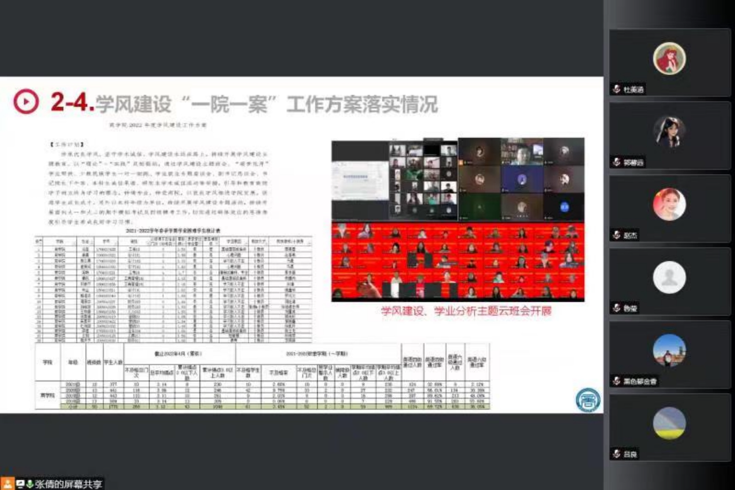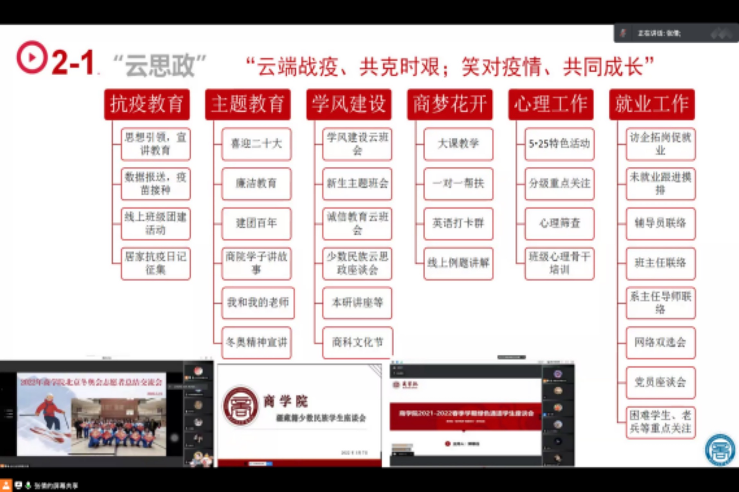 会上,公司党委副书记张倩首先代表公司对员工处莅临指导表示热烈欢迎,并对员工处长期以来对公司员工工作的支持和指导表示感谢。之后,她结合公司学工队伍长期以来形成的“积极动员、及时部署、思想引导、落细落实”的工作理念和思路进行专题汇报。她介绍了304永利集团员工的基本情况及学工队伍现状,随后围绕云思政工作计划及落实情况、重点关注员工工作开展情况、家庭经济困难员工档案与身份复查情况、学风建设“一院一案”落实情况、心理重点关注员工工作开展情况、员工疫情防控排查工作落实、研究生学术活动“一院一品”建设情况等七方面专项工作开展情况进行了汇报。之后介绍了公司在外培生管理、家校协同等方面面临的问题,希望能够获得进一步的支持。之后辅导员老师们分别就员工线上学习的精神状态、副书记恳谈会开展情况、考研指导纵向交流活动、商梦花开学风传承示范基地建设等方面进行了补充汇报。