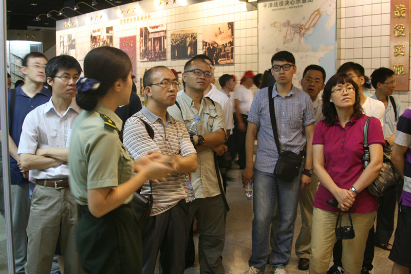 上午,当一行人到达平津战役纪念馆前的胜利广场,纪念馆主体建筑在晴朗的天空映衬下更显庄严肃穆。远远望去,高耸入云的刺刀等一系列标志性建筑古朴庄重,雄伟壮观。聂荣臻元帅亲笔题写的“平津战役纪念馆”七个金色大字,为纪念馆增添了光彩和神韵。观展期间,所有人都怀着一份崇敬与肃穆的心情,跟随讲解员缓缓踱步于各个展厅。展馆内容丰富,分为战役决策、战役实施、人民支前、伟大胜利、英烈业绩等6个部分,清晰的讲解,真实的图片,富有历史气息的实物展品,将我们带回那个烽烟四起、炮声轰隆的年代,都市的现代与繁华全部退去,而枪炮声却在耳边轰鸣,冒着炮火奋勇向前的革命战士们身影在眼前窜动,血染的军旗依然飘扬。静下心来想一想,为今日的安逸生活付出的代价又何止一场平津战役呢?当灾难袭来时,不正是因为有着中国共产党,这一伟大组织作为坚强的后盾支持,才能让中国在世界的舞台上大放异彩,尽显大国风范,才能让世界看到一个综合国力不断提升的东方古国的崛起。大家深刻的认识到正是在中国共产党的正确领导下,我们才能有今天的辉煌成绩。