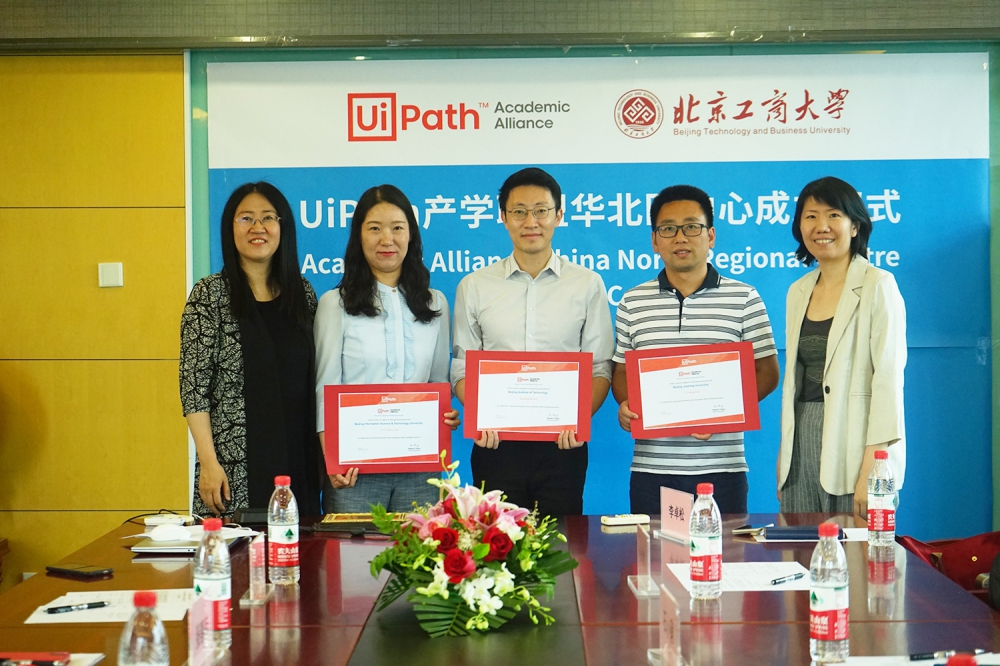 研究中心孙玥璠主任代表UiPath产学联盟华北区域中心,向加入UiPath产学联盟的北京理工大学、北京交通大学和北京信息科技大学颁发了 UIPath产学联盟合作证书。