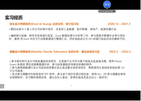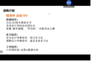 姚泽华学长是注会183(全英)班的毕业生,目前工作于小米国际部数据分析岗位。姚泽华学长在校期间任班长兼团支书,曾担任未来会计师协会社团社长,并参与了多个比赛。他曾作为审计实习生在安永会计师事务所实习,后作为鉴证业务实习生在德勤会计师事务所实习。学长为同学们详细介绍了自己实习期间的工作内容与收获,并建议同学们提前学习并掌握Excel的基本功能和高级公式。