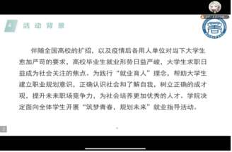 为践行“就业育人”理念,帮助老员工建立职业规划意识,正确认识社会和了解自我,提升未来在职场中的竞争力,为社会培养更加优秀的人才,2023年5月19日晚8点,304永利集团开展了“筑梦青春,规划未来”线上就业指导活动。