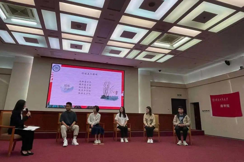 本次开幕式共邀请到本科生和研究生中的五位青春榜样,他们分别是保送本校研究生且曾获得国家奖学金的张轩睿,曾获得董事长奖学金并保送中南财经大学的杨亿慧,英语四六级全校最高分获得者且成功考取西南财经大学的魏书筱、考取北京国家会计公司研究生的张秀华,曾参与国家重大课题、在人民日报上发表学术文章、毕业季获得多个国企和央企offer、获得京考和国考面试资格的优秀在读研究生代表张博文。这些员工曾在公司、公司各级员工组织中担任员工干部,学习优秀、能力过硬,可谓是青年员工中的佼佼者。在开幕式上,主持人以访谈的形式与五位优秀学子就考研深造、学科竞赛、个人学习、求职经验、人生规划、平衡压力等方面进行对话交流,请他们对学弟学妹提出建议,在提问环节中,同学们就自己面临的困惑和问题与他们进行了深入的交流探讨。在轻松愉悦又不失深度的交流氛围中,几位榜样侃侃而谈,同学们受益颇深。