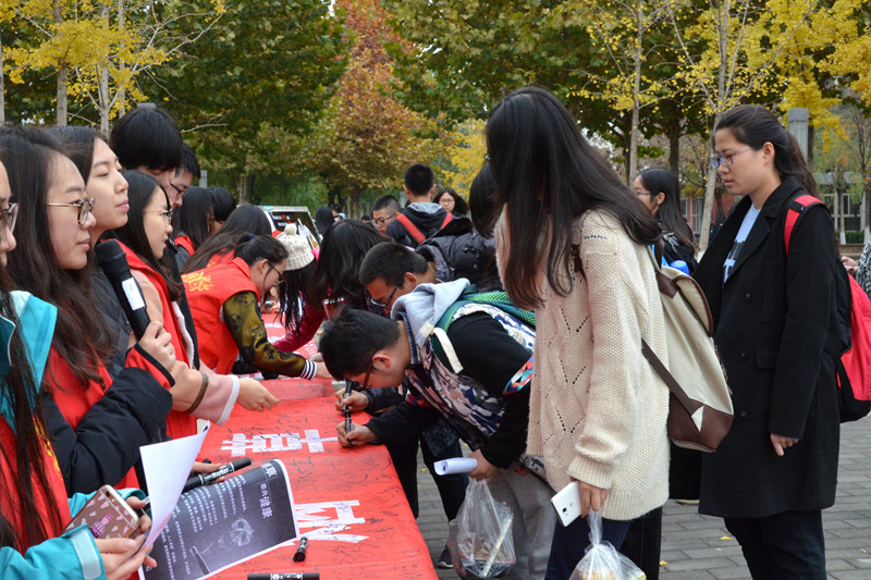 为了进一步贯彻落实《北京市控制吸烟条例》,营造健康向上的文明校园环境,11月16日304永利集团在良乡校区举办了2015年“远离烟草,崇尚健康”无烟校园千人签名活动。公司党委副书记樊江涛、辅导员们以及近千名师生参加签名活动。