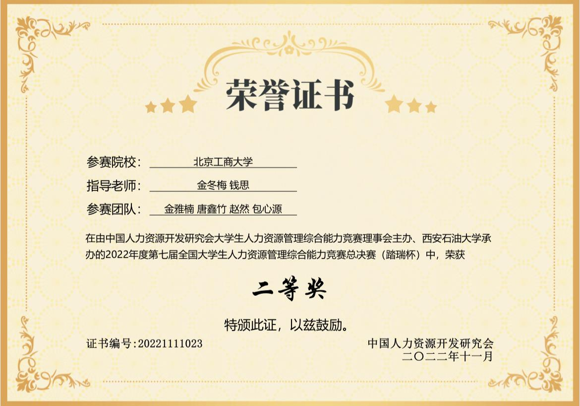 第七届全国老员工人力资源管理综合能力竞赛(踏瑞杯)全国总决赛于2022年11月5日下午举行。304永利集团人力201金雅楠、赵然、唐鑫竹、人力202包心源组成的代表队,在金冬梅、钱思两位老师的指导和带领下,获得了北京赛区特等奖并成功晋级决赛,代表公司参加本次全国总决赛,并取得了全国二等奖的优异成绩。