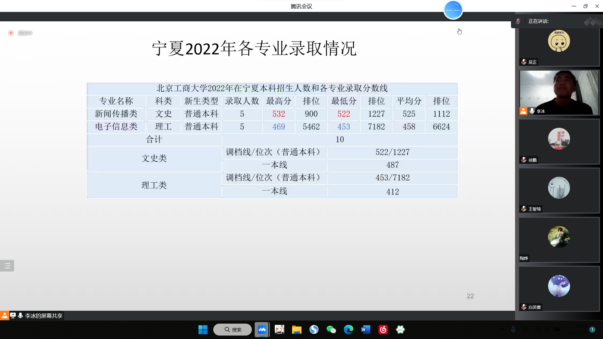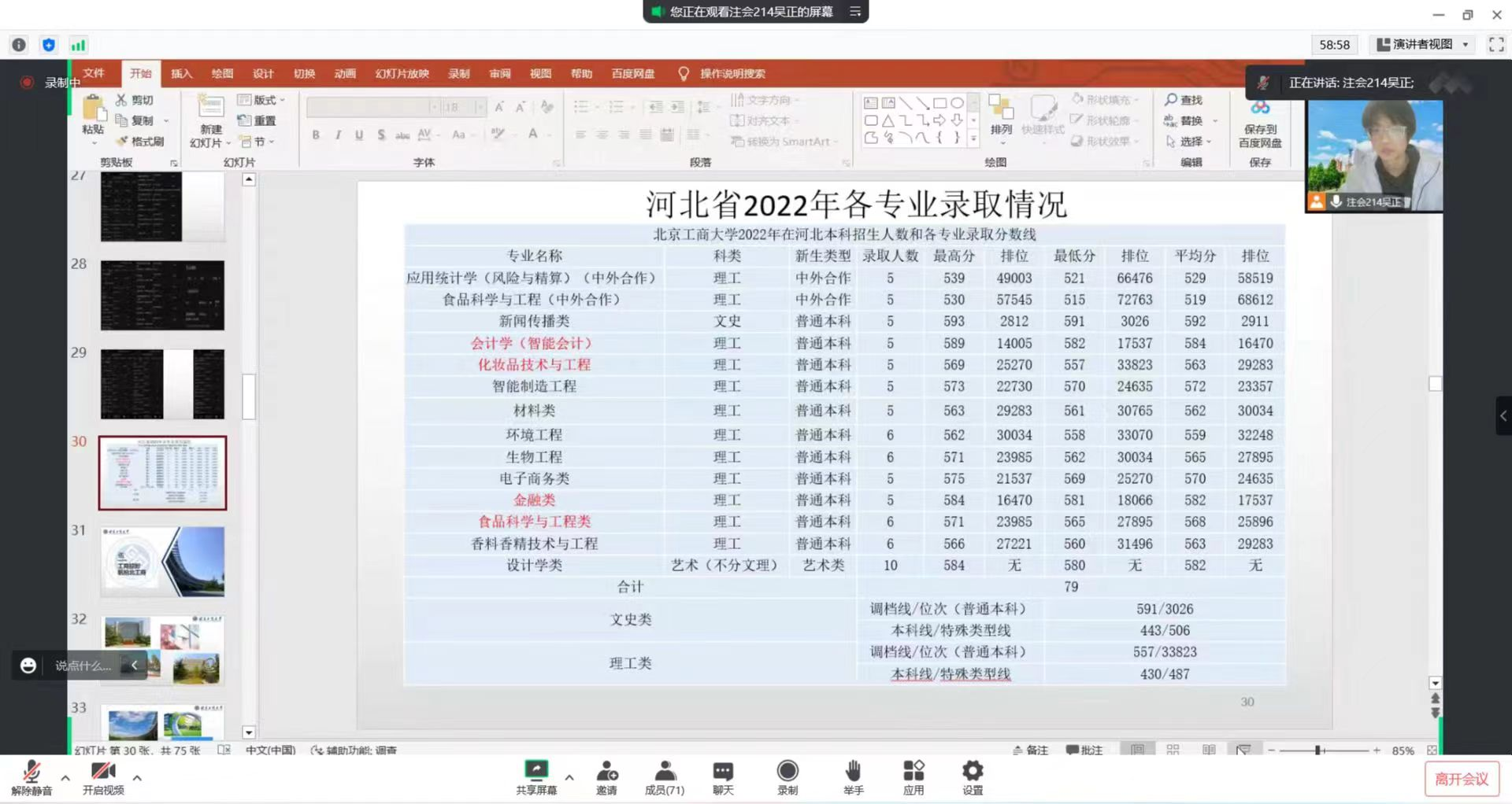 我提前联系高中老师,通过腾讯会议的形式,利用高中员工上晚自习的时间,播放了公司的招生宣传片,让学弟学妹对于公司有了初步的了解。随后我开始讲解公司的招生宣传PPT,对公司的校园环境,特色专业,团队力量以及生活体验进行了详细的介绍。最后,通过问答的方式,解决了他们对老员工活和北工商有关的好奇,由高中老师将公司有关的宣传材料发给学弟学妹。