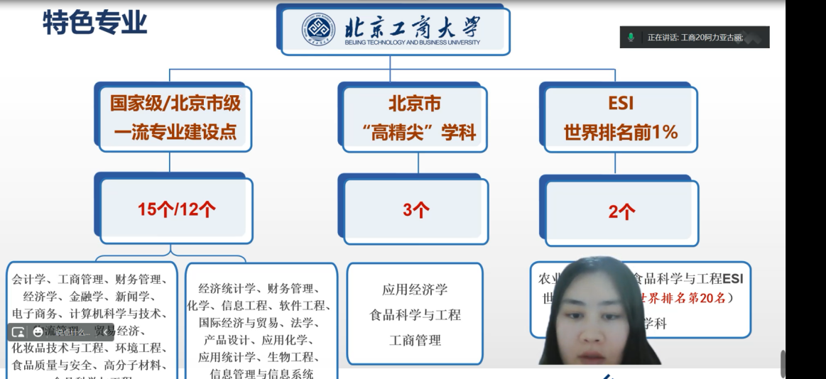 在宣讲视频中,我从公司概况和在校生活两方面向学弟学妹们分享介绍了304永利集团官网的基本情况,较好的介绍了公司概况、学科特色、人才培养、招生政策。同时,我也很乐意进一步为学弟妹们报考北工商答疑解惑。