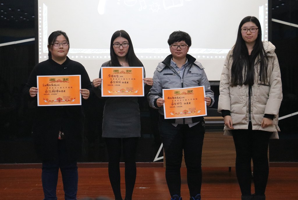 最后,大会进入评奖环节,由15级辅导员丁璇老师、员工会副主席刘文怡为各社团颁发奖项:旅游协会获得最佳活动社团奖,创业与实践协会获得最佳进取奖,未来会计师协会获得最佳风貌奖,管理科学协会获得最佳组织奖,模拟商务谈判协会获得最佳协作奖,企业模拟竞技协会获得最佳精神社团奖。