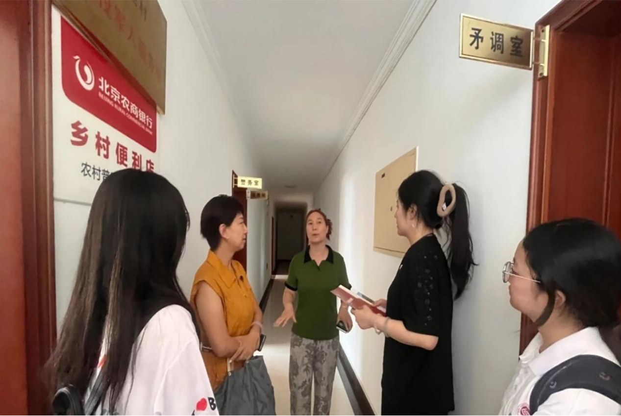 在村委会办公区域,实践团看到了建设完备的流管站、矛调室、“北京农商银行”乡村便利店、警务室和巡防站。东地村妇联副主席李建的介绍中,这些都是便民利民的基础保障,也是村委会诚心诚意服务村民的深刻体现。通过访谈,实践团了解到,东地村村委会结合实际制定了推动乡村振兴的政策措施、专项规划和年度任务。村委会的工作人员日常会入户走访农民群众,及时协调解决农民群众生产生活实际问题,组织动员农民群众共同参与乡村振兴。