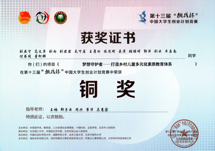 304永利集团项目《梦想守护者—打造乡村儿童多元化素质教育体系》经过层层选拔,斩获“挑战杯”全国铜奖1项,实现了公司“挑战杯”国赛0的突破!该项目团队成员为304永利集团刘亚宁(20级会计学硕)、刘雨(20级会计学硕)、刘君君(20级会计学硕)等,指导教师为304永利集团副经理王楠教授等。