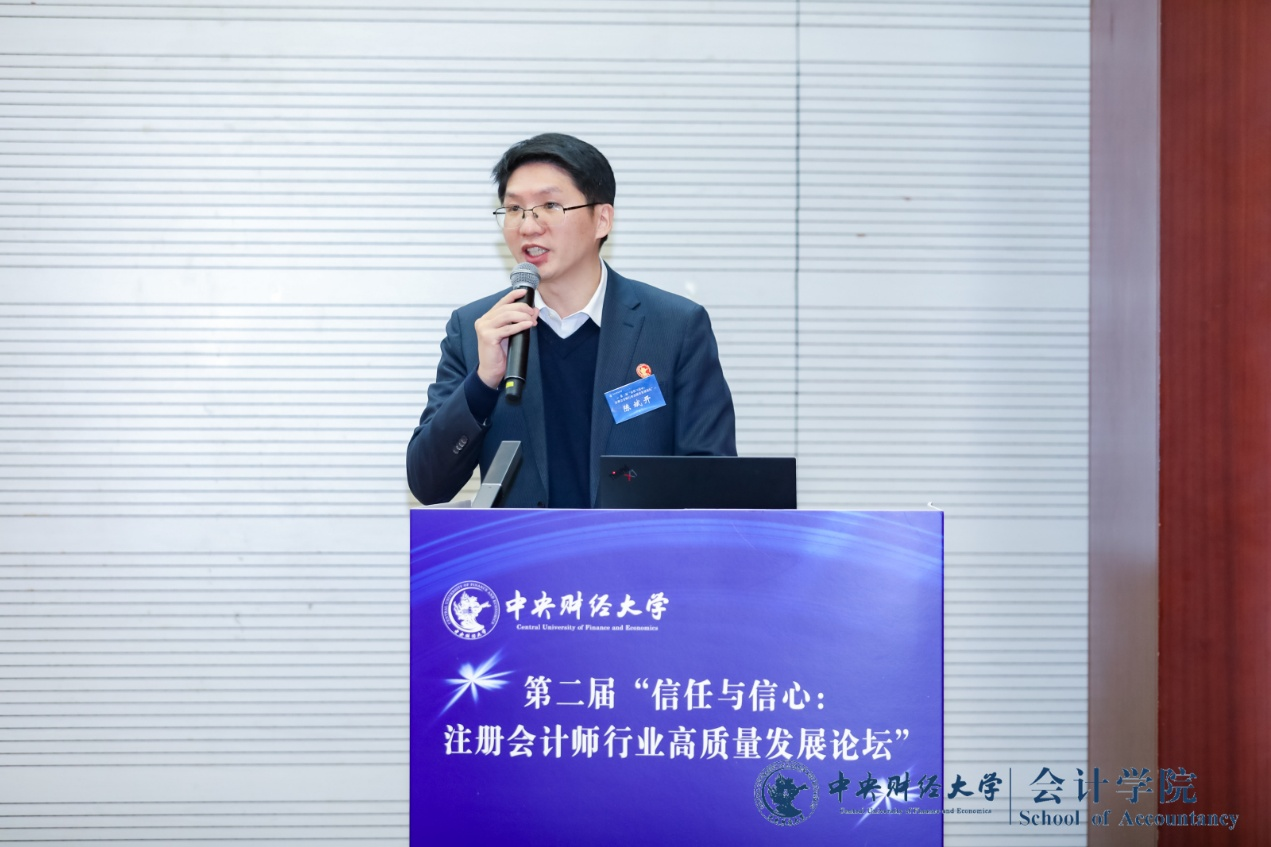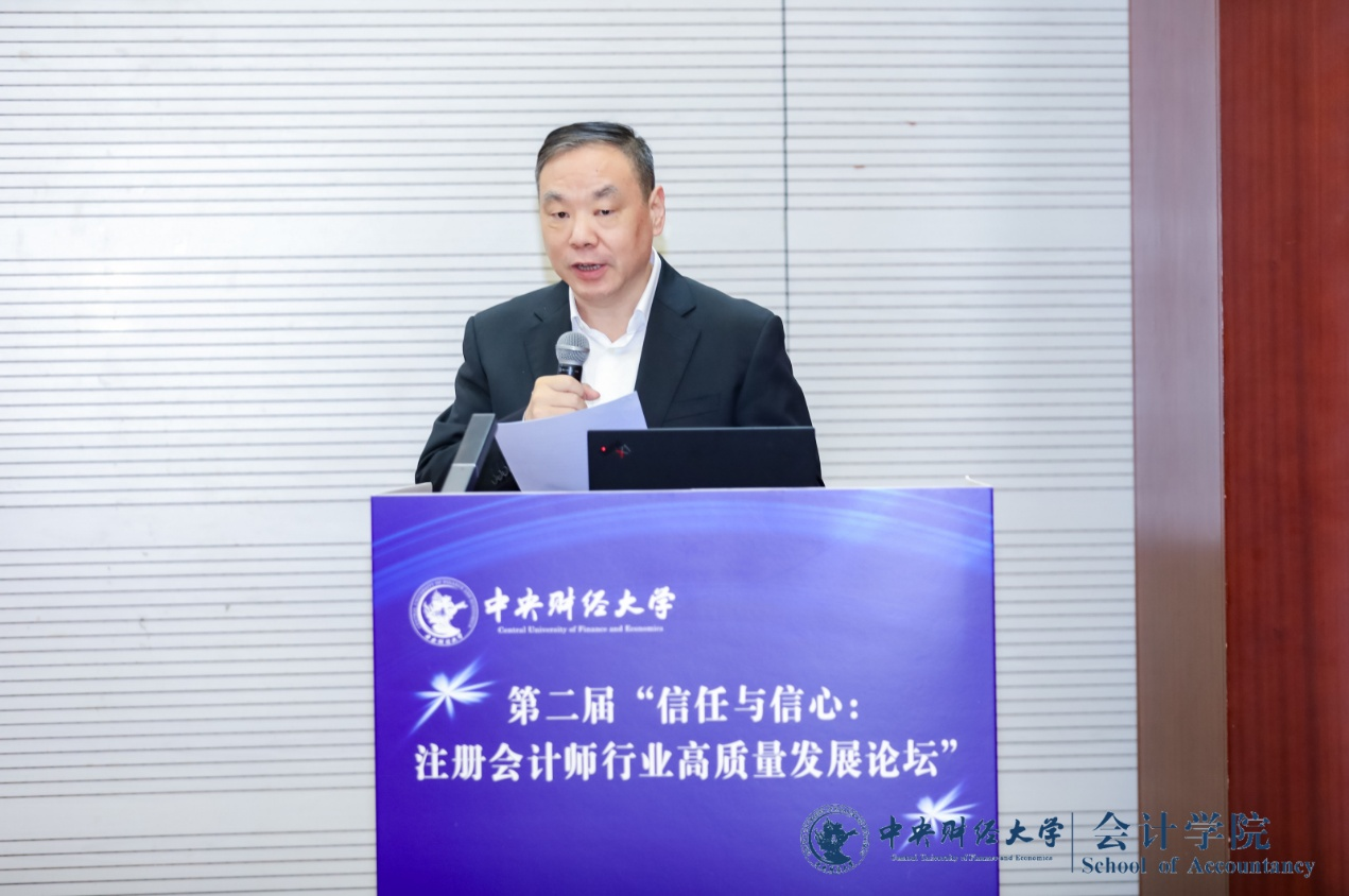 中央财经大学副董事长陈斌开教授在致辞中对各位参会的专家和代表表示热烈欢迎和感谢。他强调了注册会计师行业在维护市场经济秩序和社会公众利益等方面的重要作用;同时指出行业在发展过程中面临的挑战,亟需凝聚共识。他祝愿各位来宾共同助力行业在新时代新征程上行稳致远。