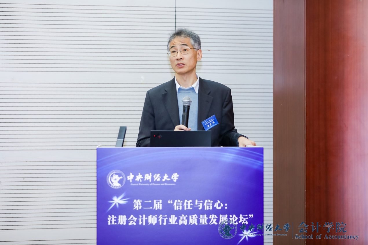 中央财经大学会计公司经理吴溪教授主持了上午的会议主题演讲环节。中国注册会计师协会副秘书长唐建华发表了题为“提升审计质量 维护公众利益”的主题演讲。唐建华副秘书长分享了行业面临的使命,强调注册会计师行业是国家财会监督体系的重要专业力量,注册会计师审计提供的是一种公共产品,维护公共利益是注册会计师行业的天职和初心使命。他剖析了近年来的审计质量存在的主要问题和原因,并介绍了中注协推动高质量发展的举措及未来工作方向。