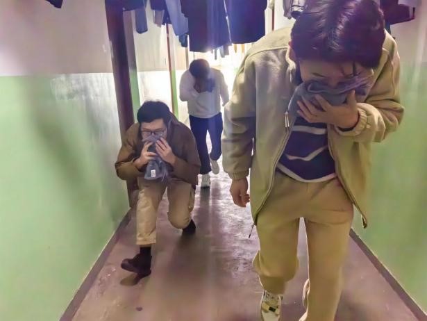 在疏散逃生演练中,商院员工在接到火灾疏散指令后,迅速用湿毛巾捂住口鼻,低姿势弯腰前行,认真遵循着火场逃生的基本步骤和注意事项,从宿舍内有秩序、不慌乱地快速撤离到安全地带。整个演习中,同学们分工明确、配合有效、井然有序。
