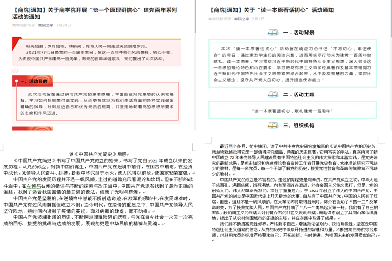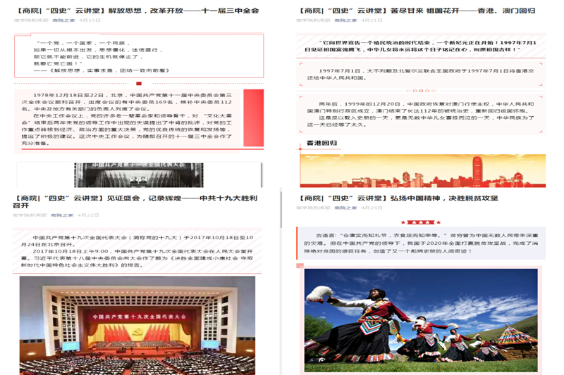 为积极响应习近平总书记关于深入学习党史、新中国史、改革开放史、社会主义发展史的号召,304永利集团开展了学习“四史”系列活动。通过“商院之家”公众号定期推送发布“四史”知识学习文章,目前已经发布14期,内容包括党的成立、开国大典、中苏建交、党的十九大会议、抗击疫情、脱贫攻坚等,引导同学们深刻认识到了新中国和中国特色社会主义来之不易,了解中国共产党先进的政治属性、崇高的政治理想、高尚的政治追求和纯洁的政治品质。