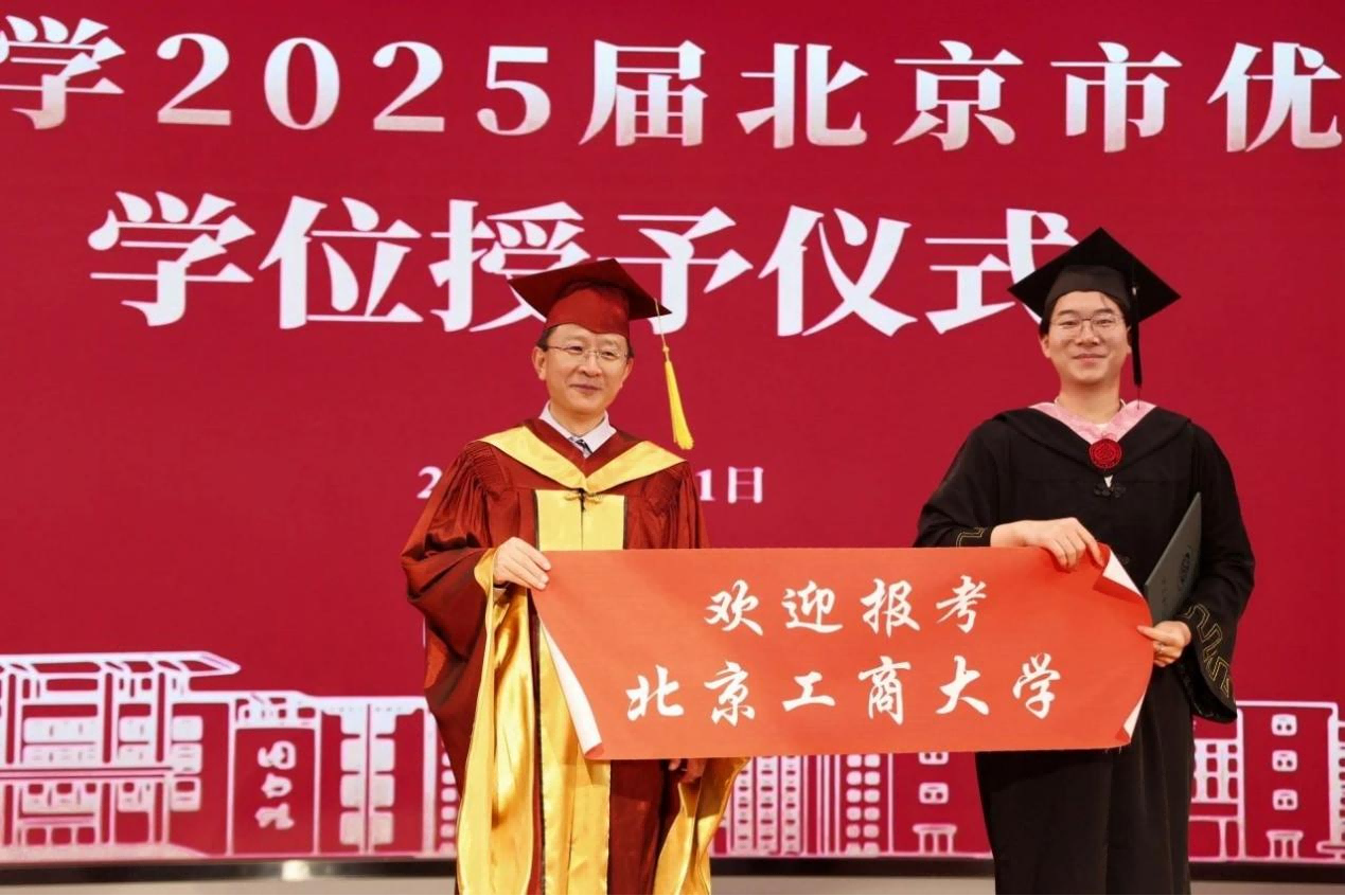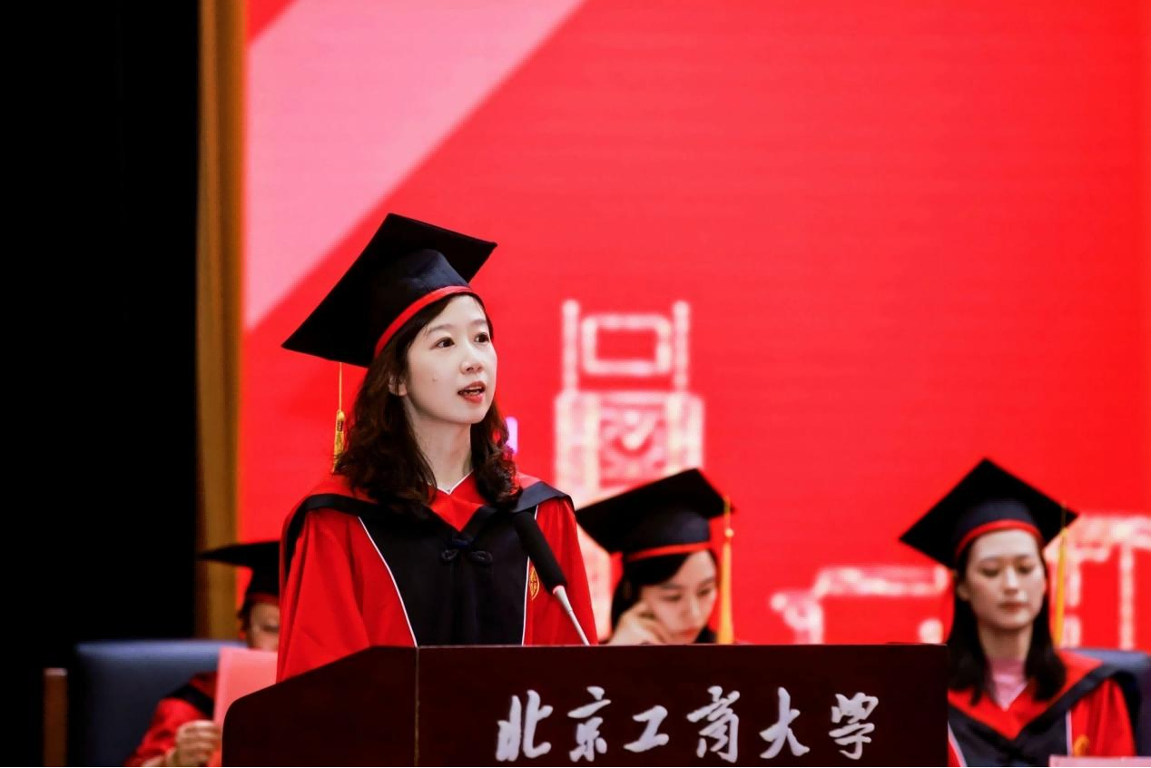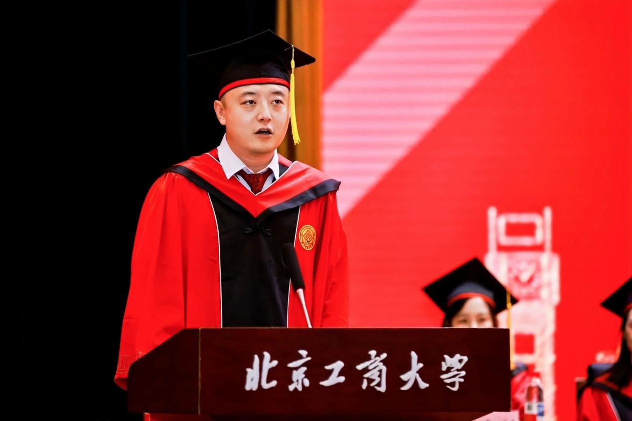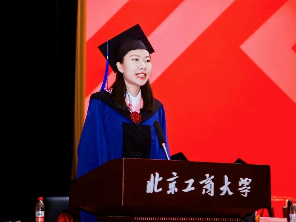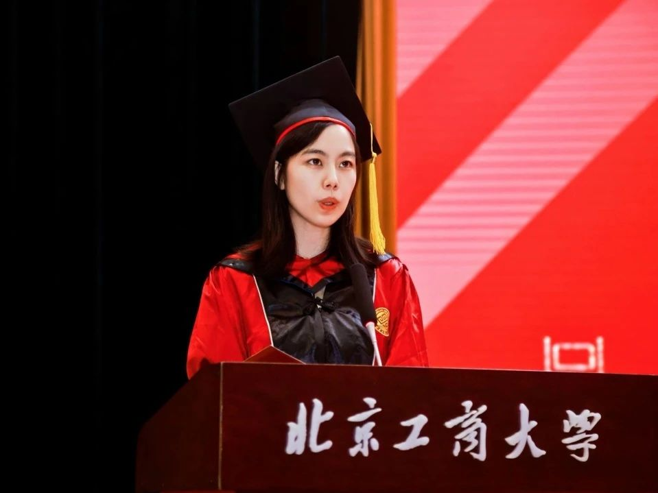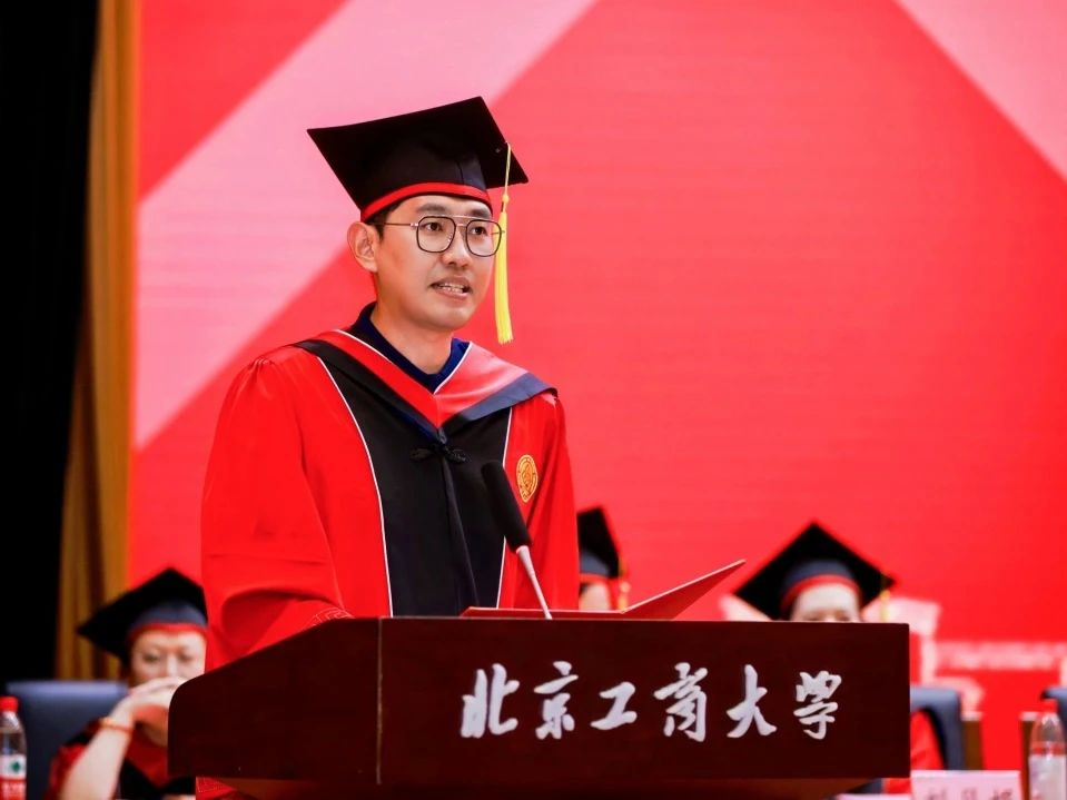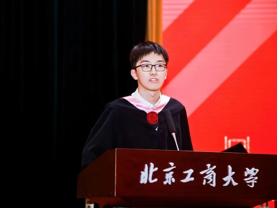 本科生毕业生代表苏柯木分享了四年的共同成长与集体记忆。他回顾了与公司共进的时光,亲历校园解封、智慧教室升级等变革,也见证了“工商一体”理念的深化。面对求学路上的试炼与选择,他坚定地强调所有经历都沉淀为北工商赋予的独特底气,此刻拥有的不仅是青春年华,更是面向未来的自信目光。他代表全体本科毕业生感恩母校与师长的培育,坚信前路无论坦途或曲折,都将带着这份积淀勇敢前行,拥抱无限可能。