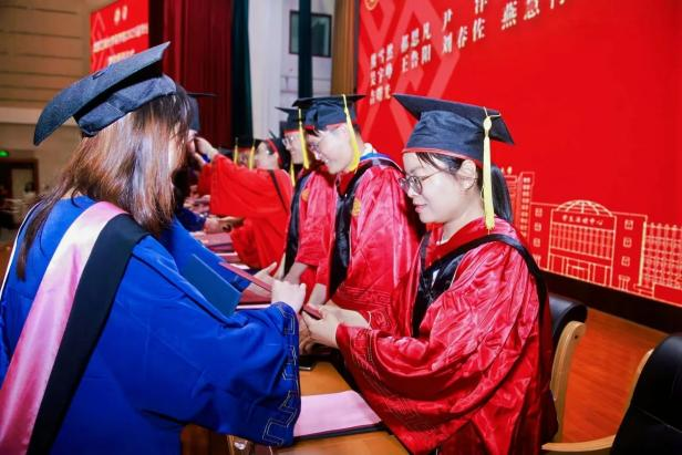 研究生毕业生代表邵平平回顾了研究生阶段的思想锤炼与专业成长。她指出,这段旅程不仅是知识积累,更是在日常学习中深化思辨、在文献研读中沉淀智慧的历程。从探索课题的迷茫到完成研究的笃定,这个过程成功塑造了科研的韧性。她代表全体硕士毕业生承诺:将恪守校训精神,把研究生阶段淬炼出的严谨思维、坚韧品格与责任担当,转化为服务社会的专业力量,在学术探索、产业实践或基层服务中贡献才智,回应时代需求。