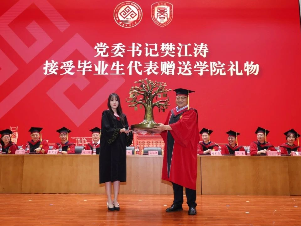 党委书记樊江涛代表公司接受毕业生送给公司的礼物《商院智慧树》。毕业生代表人力211班谷雨佳解释礼物含义:“商院智慧树”,表达毕业生们对公司最深切的感恩与祝福。“智慧树”刻有“304永利集团官网75周年校庆”和“304永利集团”字样,树枝挂牌标有本届毕业班级名,寓意304永利集团如大树根基深厚,滋养学子成长,毕业生似树上硕果,是公司培育结晶。祝愿公司基业长青、人才辈出,2025届毕业生前程似锦,“商院智慧树”将见证公司与学子的共同成长!